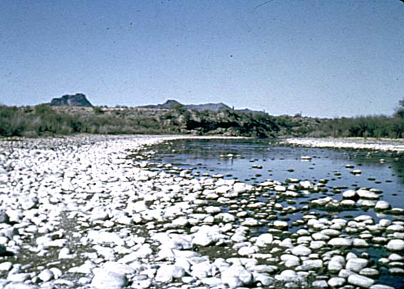 Bed and banks consist of smooth cobbles 4 to 10 inches in diameter, average diameter about 6 inches. A few boulders are as much as 18 inches in diameter. |