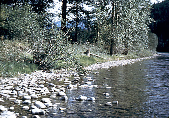 Bed of gravel and well-rounded small boulders. Right bank is fairly steep and lined with trees and brush. Left bank slopes gently and has tree and brush cover below section 2. |