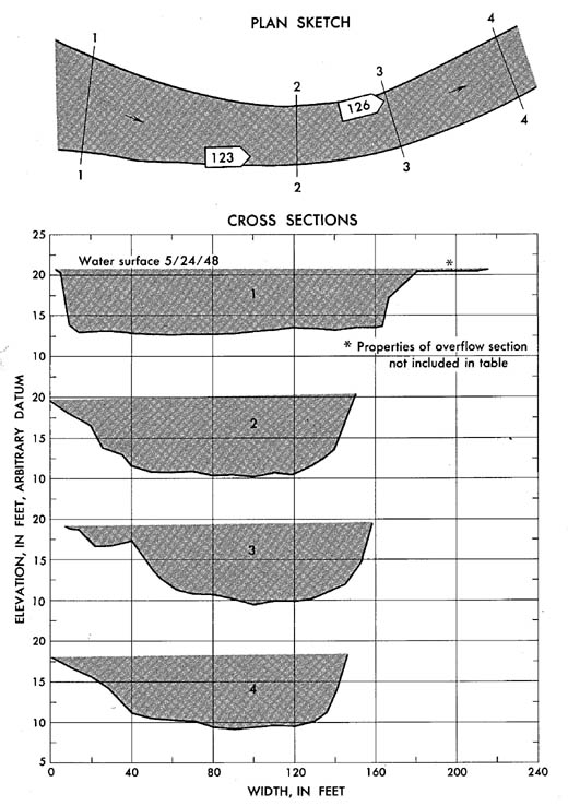 10.25 ft at gage: 20.68 ft (different datum) at section 1. |